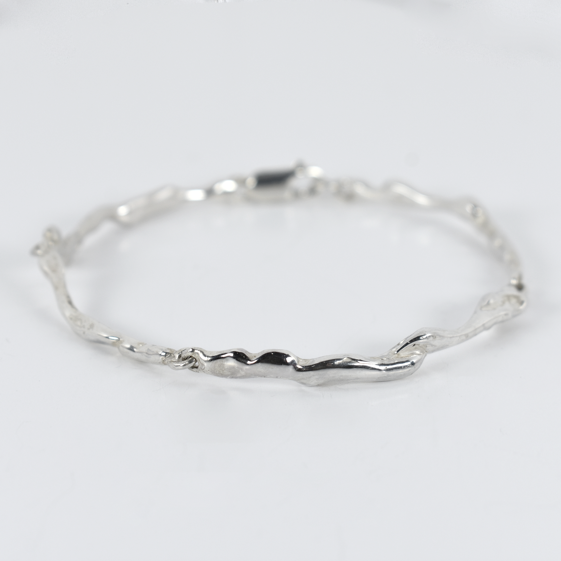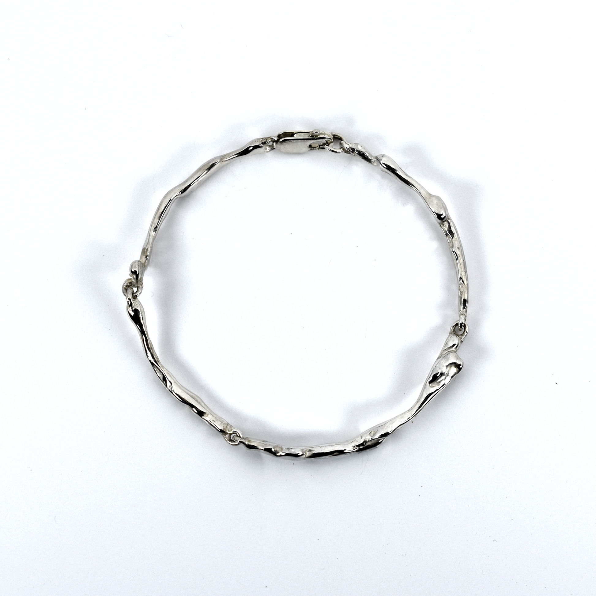 The Going with the Flow Bracelet, part of the Drippy Collection, is the first sterling silver wrist piece from Hyland Carter. Each link is individually created, meaning every side of this bracelet is unique. Fitted with a lobster clasp closure and measures at 7 inches long (end to end) with room for an extension if needed.