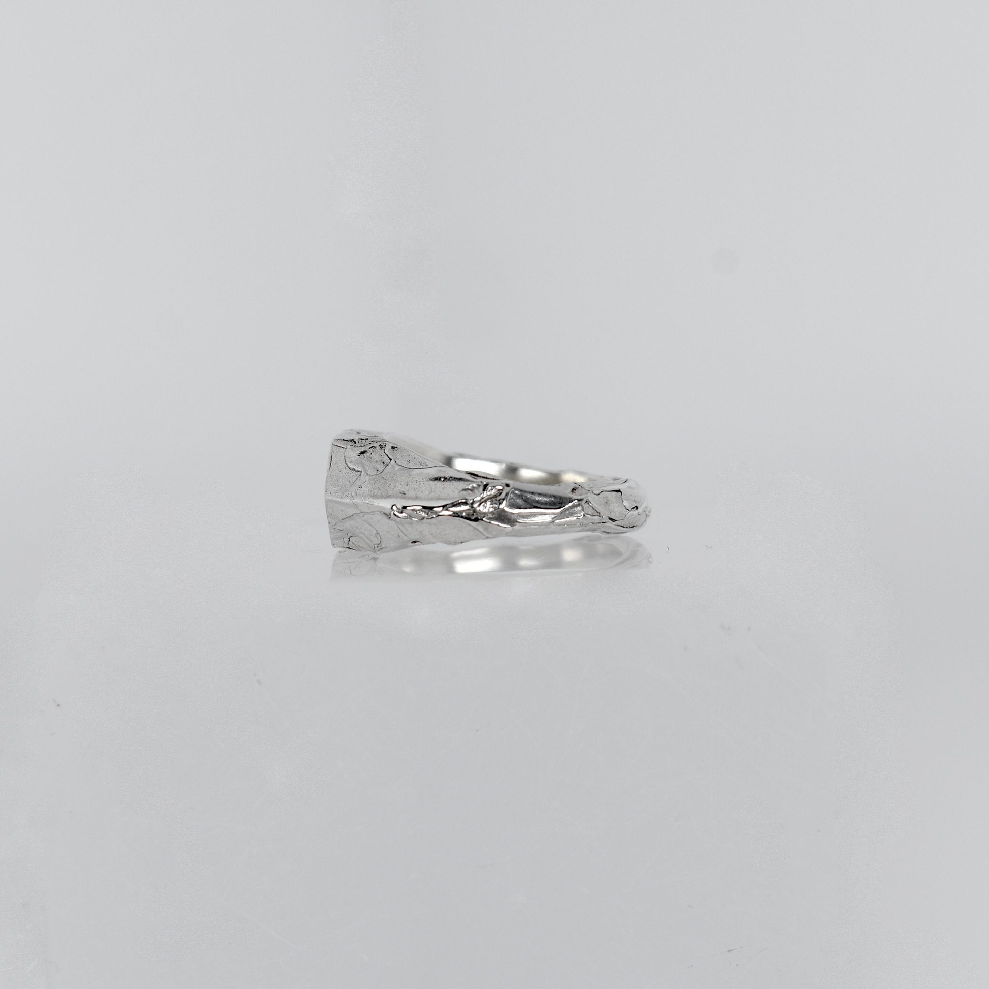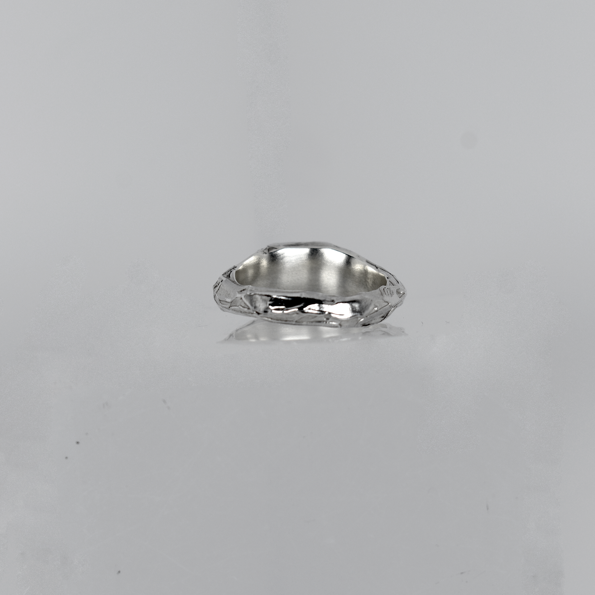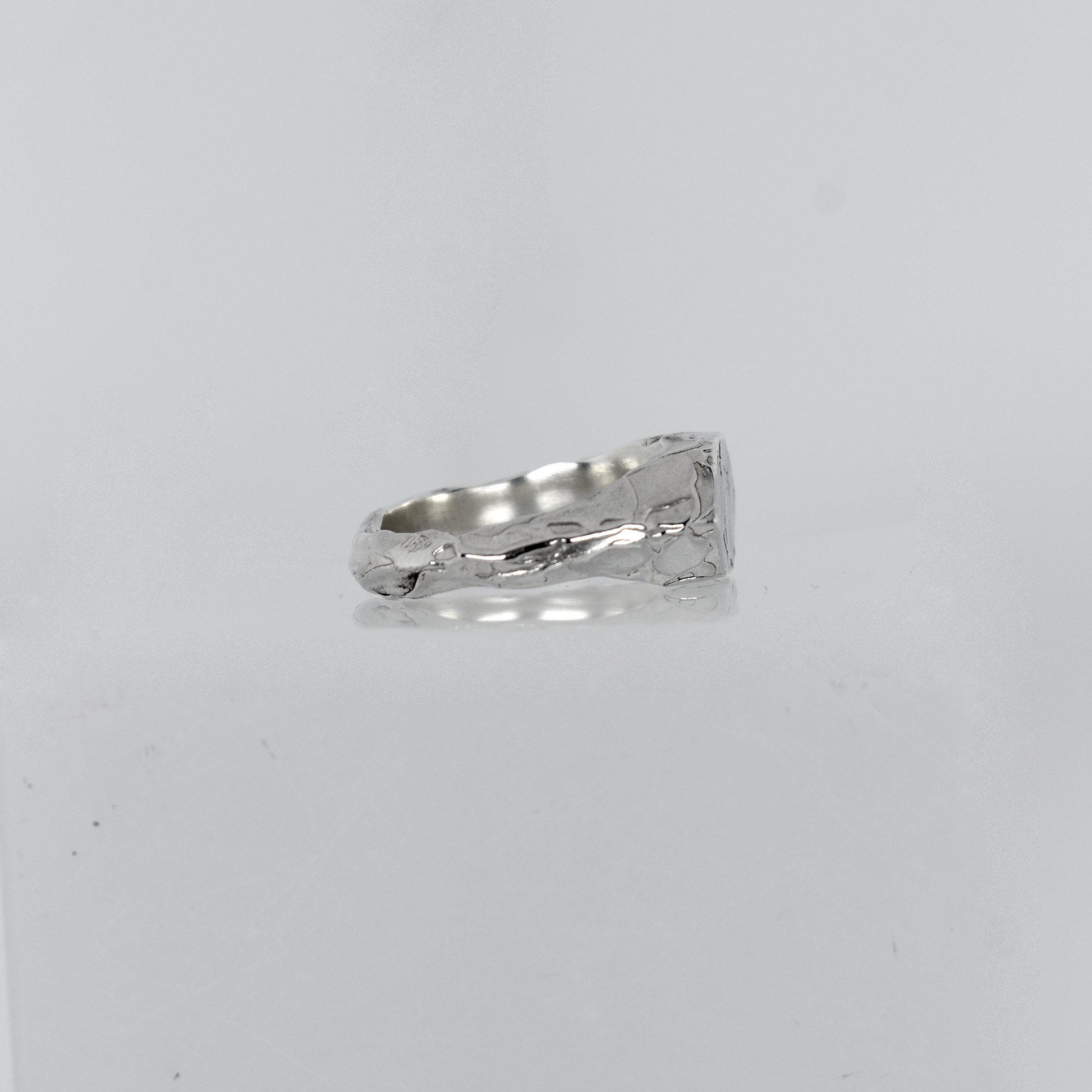 The Achernar Signet ring features a textured, flowing surface, hexagonal face with a smooth inner band in a size P. This ring allows for resizing to almost any size.