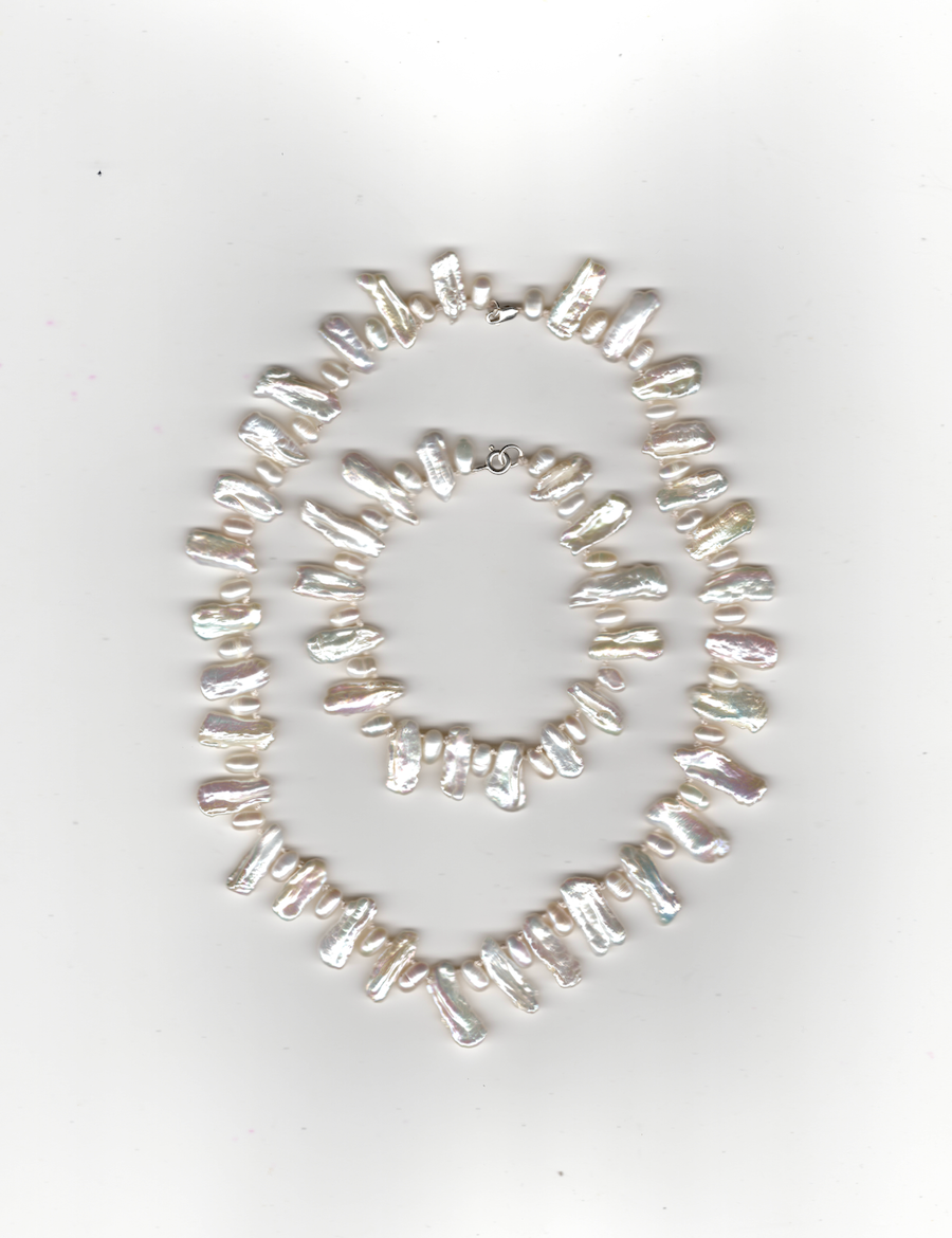 Inspired by the time my Nan was given someone else’s dentures, this set is hand-strung with Freshwater Pearls and completed with Sterling Silver Findings.
